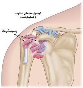- التهاب و فیبروز در کپسول مفصل این روند با التهاب اولیه در کپسول مفصل شانه آغاز میشود و به تدریج با تشکیل بافتهای فیبروتیک یا اسکار همراه است.این بافتها باعث ضخیم شدن و چسبندگی غشای اطراف مفصل میشوند که نتیجه آن کاهش فضای داخل مفصل و محدودیت حرکات شانه است.